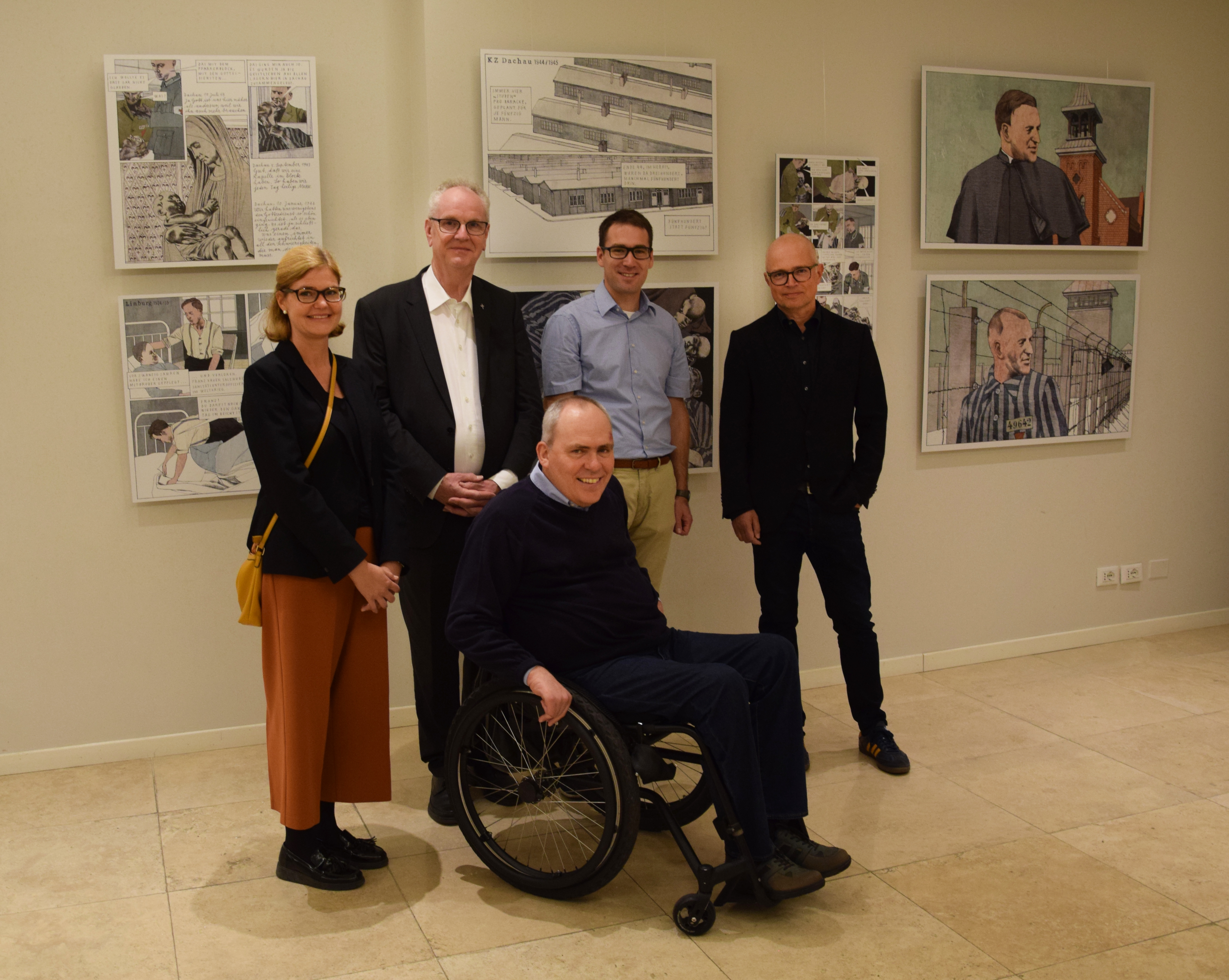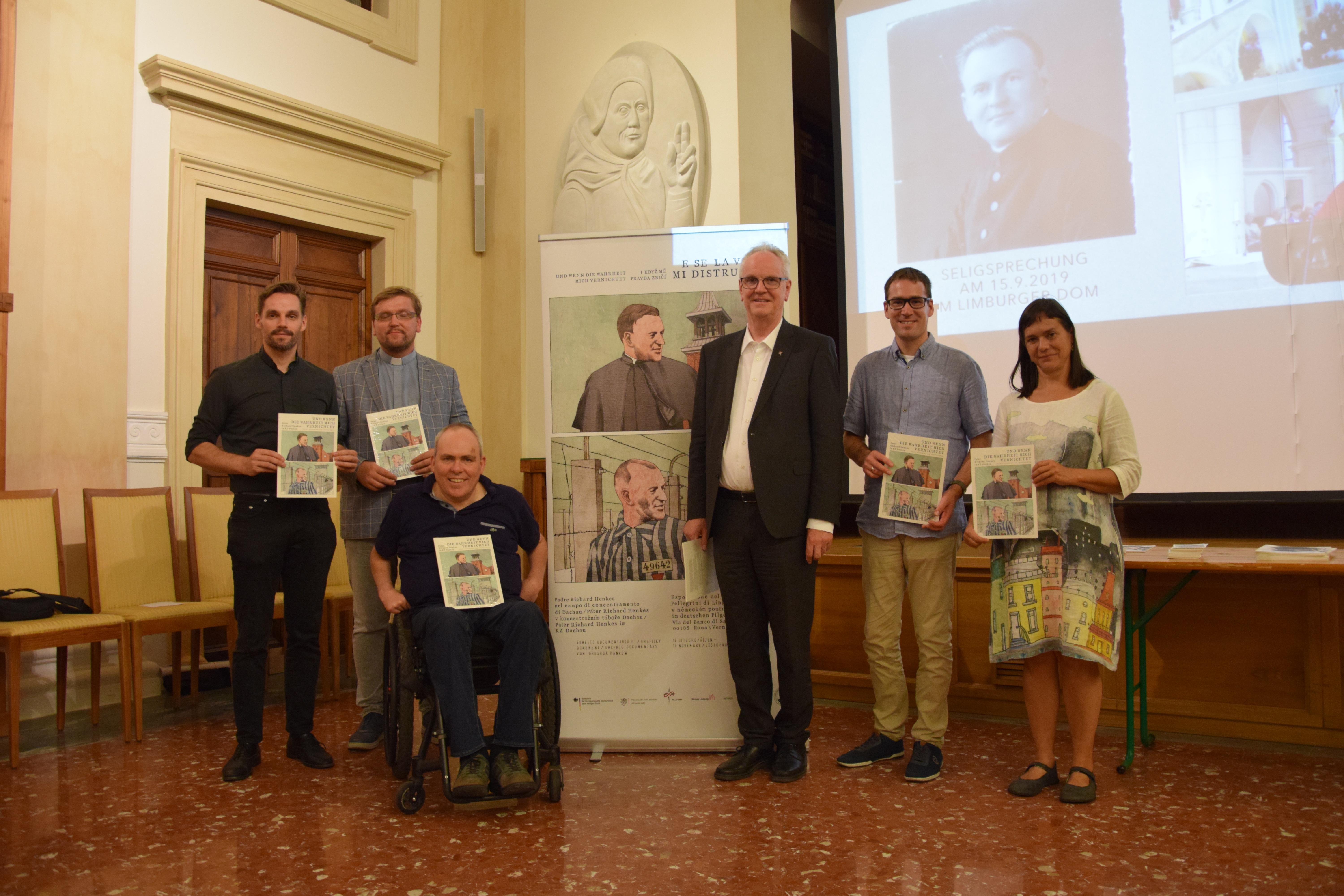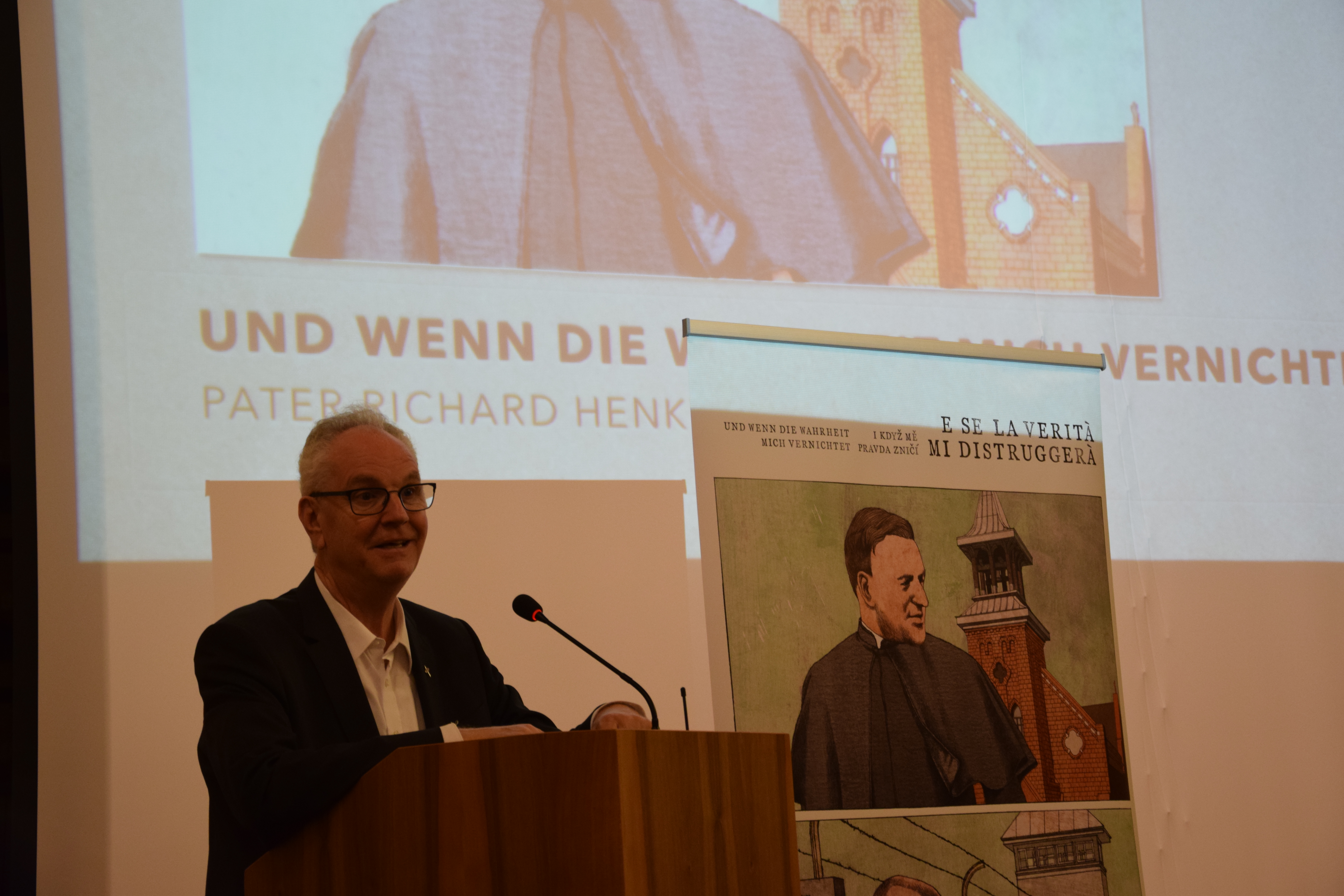 Seit dem 17. Oktober zeigt das Deutsche Pilgerzentrum in Rom nahe der Engelsbrücke eine Ausstellung über den Seligen Richard Henkes. Die Initiative dazu kam von Martin Ramp, der in der Abteilung Schule und Hochschule des Bischöflichen Ordinariates in Limburg arbeitet. Er hatte zur Seligsprechung von Pater Henkes 2019 die Idee, Leben und Botschaft dieses Mannes in zeitgemäßer Form besonders jungen Menschen nahezubringen. So entstand die Graphic Documentary von Volker Schlecht mit dem Titel „Und wenn die Wahrheit mich vernichtet“. Diese inzwischen vielfach ausgezeichnete Arbeit des Berliner Künstlers wurde von Andreas Thelen-Eiselen mit Unterrichtsmaterial bereichert und wird heute im Religionsunterricht verwendet. Etliche der Grafiken von Volker Schlecht bilden großformatig die Ausstellung, die jetzt in Rom zu sehen ist (noch bis zum 17. November). Gefördert wurde das Projekt von der Deutschen und der Tschechischen Botschaft beim Vatikan, denn inzwischen gibt es auch eine tschechische Ausgabe der Graphic Documentary und des Schulmaterials. Dr. Tomas Cyril Havel und die Religionspädagogin Eva Muronova aus der Diözese Ostrava-Opava haben diese Übertragungsarbeit geleistet.