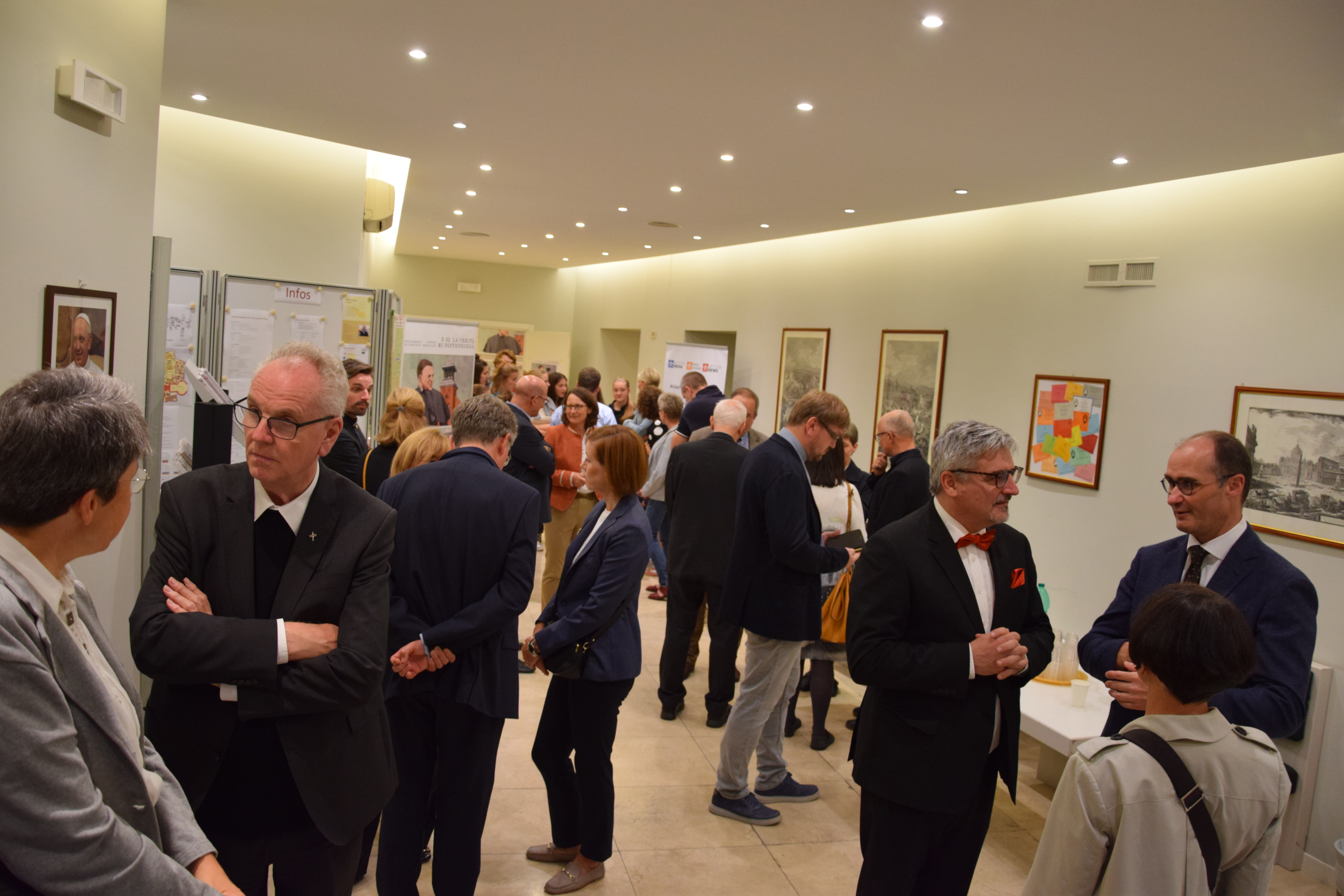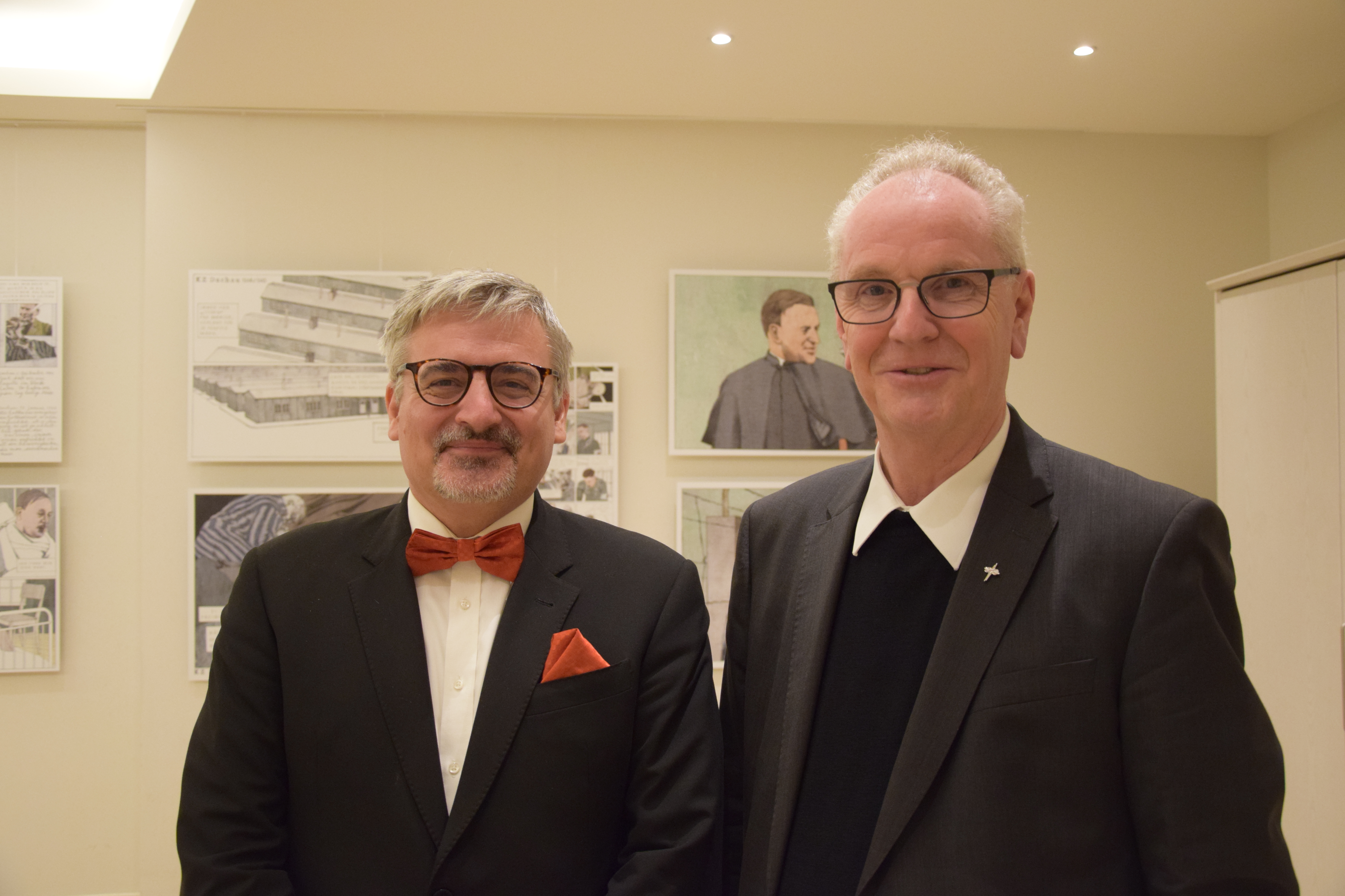 Sie waren beide bei der Ausstellungseröffnung anwesend, ebenso die Botschafter der Deutschen und der Tschechischen Vatikan-Botschaft, Dr. Bernhard Kotsch und Vaclav Kolaja. Martin Ramp erläuterte kurz die Geschichte der Ausstellung und Prof. Holger Zaborowski erschloss das pädagogische Konzept. Er verwies darauf, dass es hier weniger um einen Blick in die Geschichte als um eine Sensibilisierung für die Gegenwart gehe. Denn immer sei Zivilcourage gefordert, wenn das christliche Menschenbild infrage gestellt sei. Auch in unserer Zeit gebe es die Versuchung, die gleiche Würde aller Menschen zu hintergehen. Volker Schlecht betonte in seinem Grußwort, dass ihn gerade dieser Moment am Leben von Pater Henkes angesprochen habe, dass da jemand gewesen sei, der keine Angst gehabt habe vor dem Machtgebaren der Mächtigen, sondern sich immer der Wahrheit und der Wahrhaftigkeit verpflichtet sah.