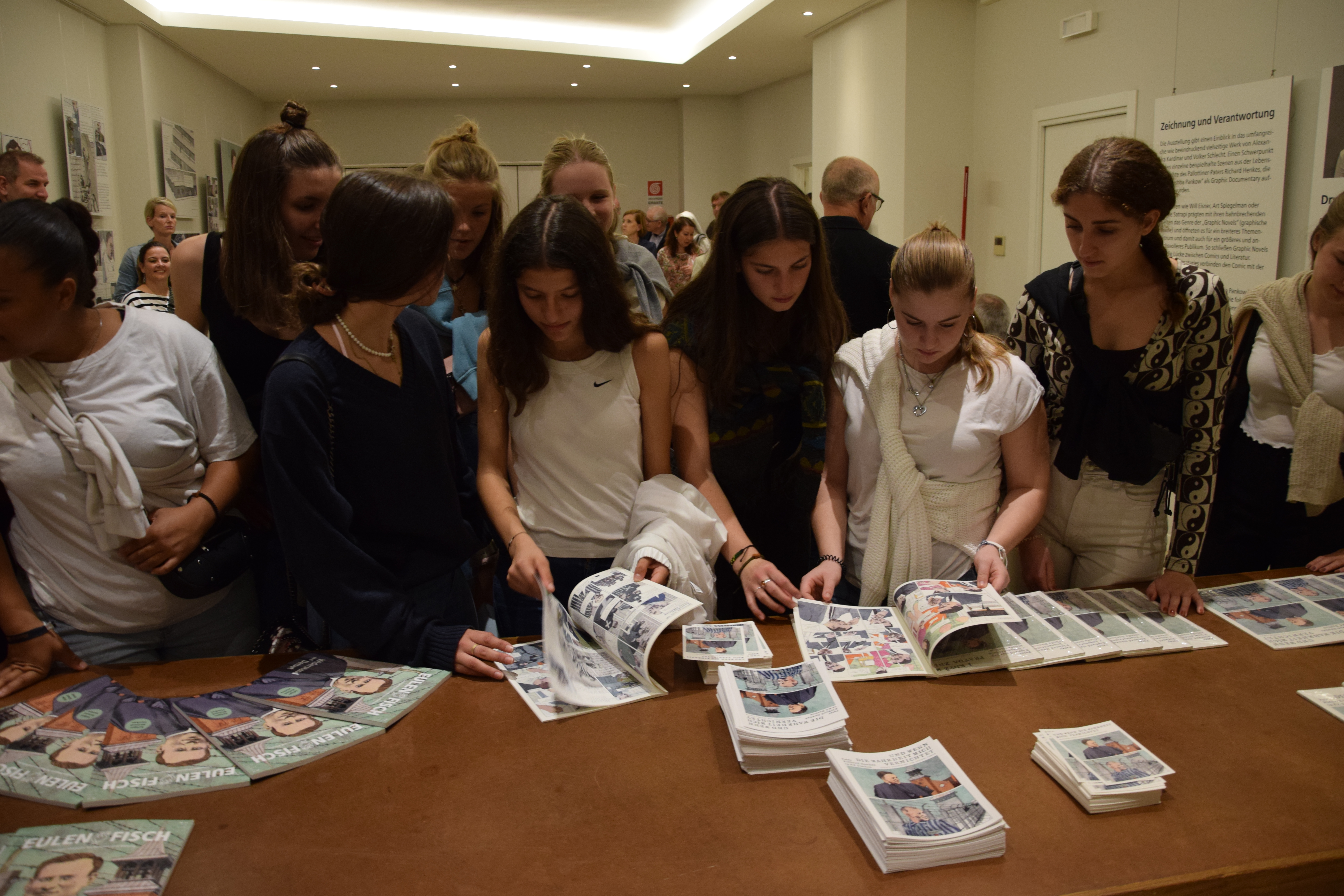 Schülerinnen und Schüler interessieren sich für das Begleitmaterial zur Ausstellung.